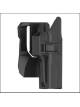Glock 17 se potrivește perfect in el. Portul pivotează in jurul axului, e stabil pe centură, arma e bine asigurată si se scoate ușor.